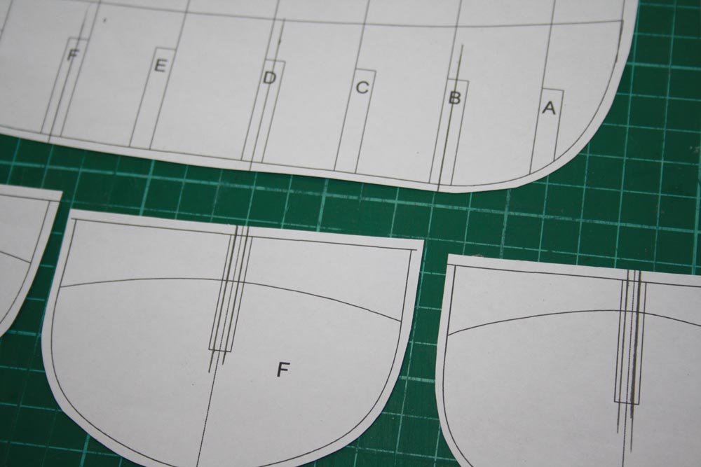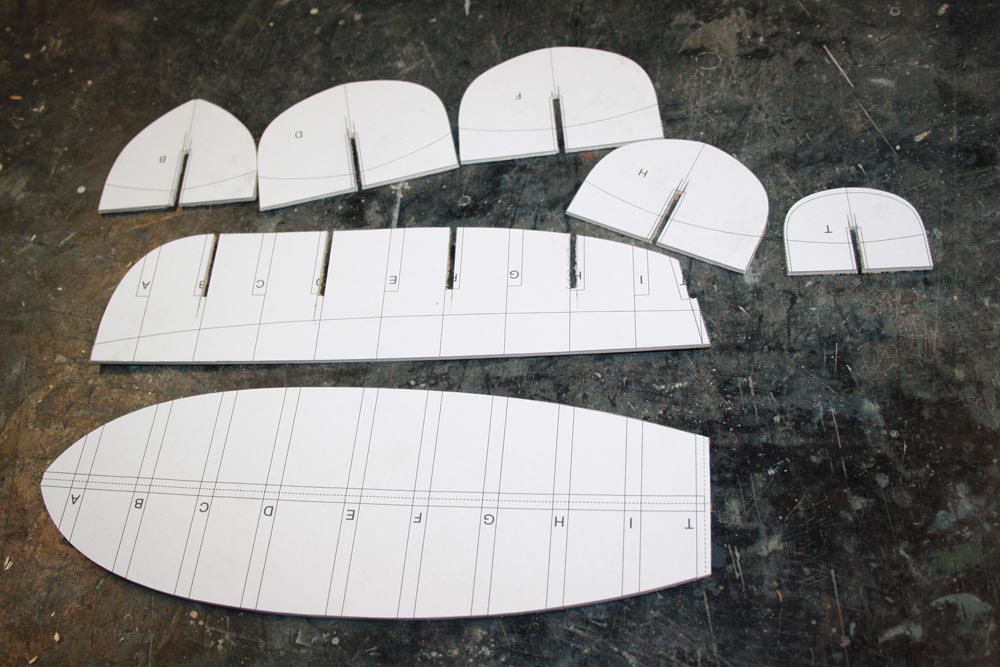 I cut out each frame template with a few millimeters extra around the outside. I will only be using every second frame for the mould. Because I am using 3mm plywood each frame and the keel will need the width of the slot modified to 3mm rather than the 6mm of the plan. A simple line drawn with a pencil on the appropriate frames is all that is required.