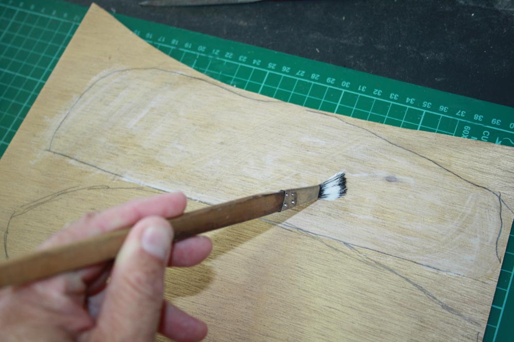 I use a stiff brush dipped in some water to help thin the glue and brush it around. The paper template is placed onto the ply and wiped over with a rag to make sure all edges stick.