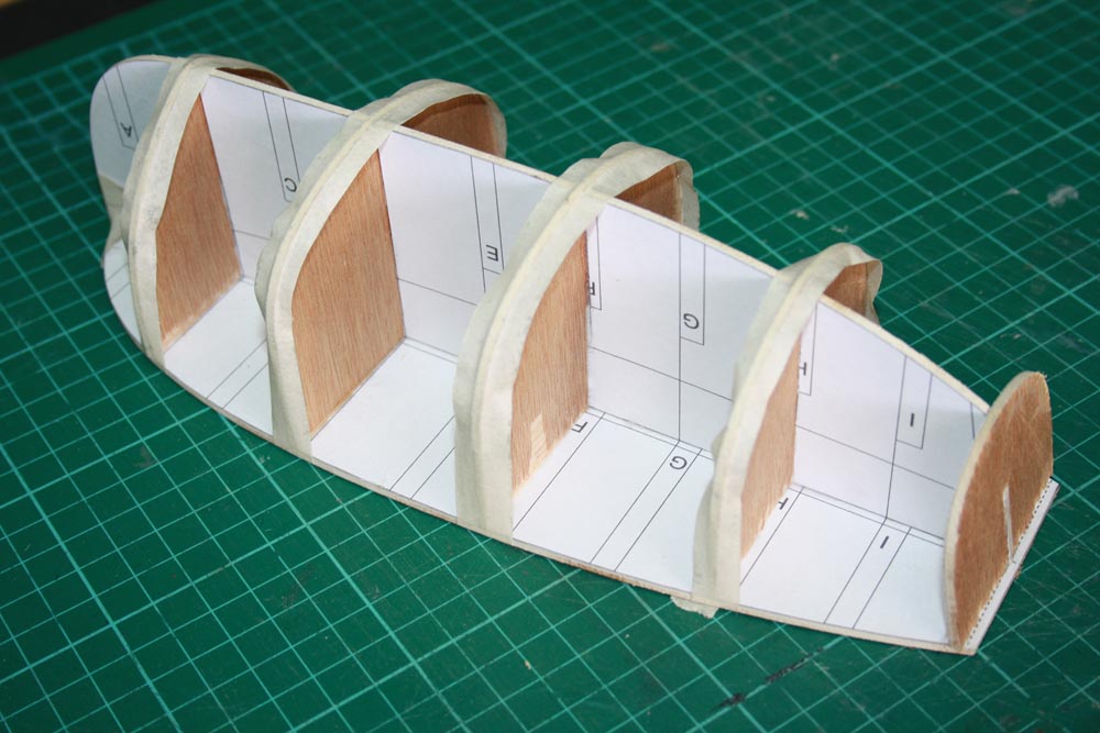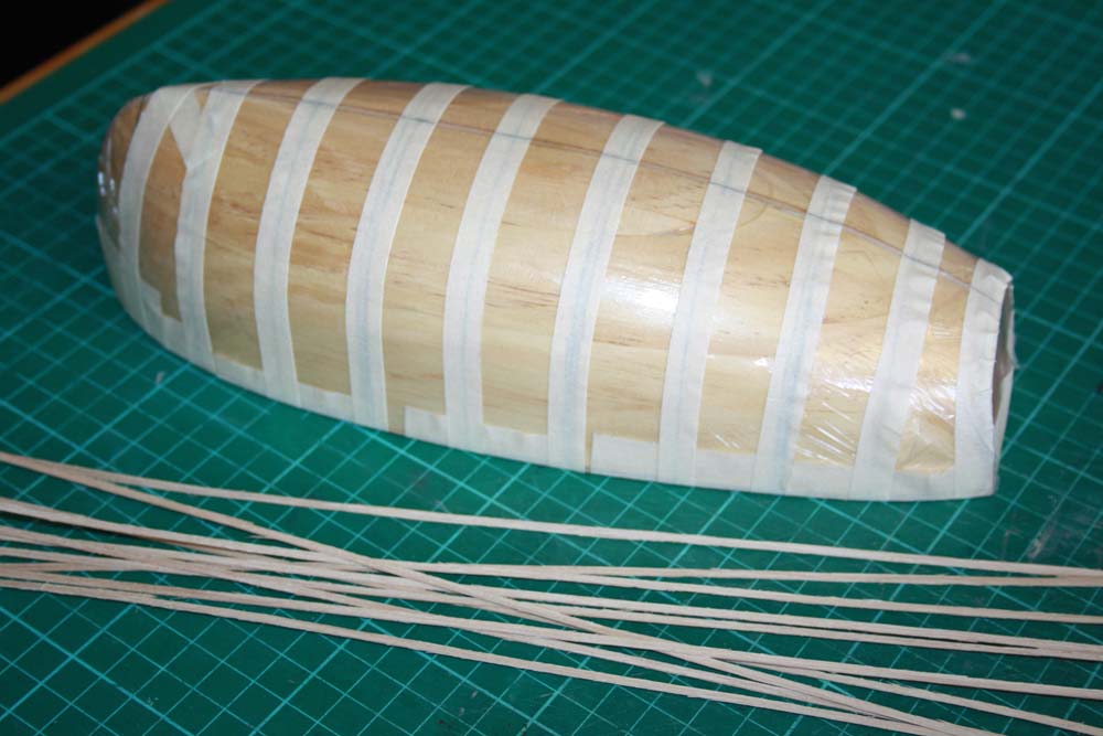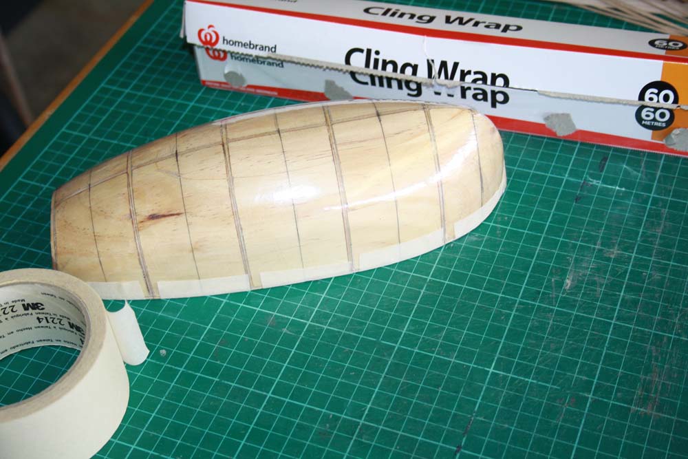 To stop the planks and ribs from sticking to the plug I stretched some cling wrap over the plug holding it in place with masking tape along the bottom edge.
