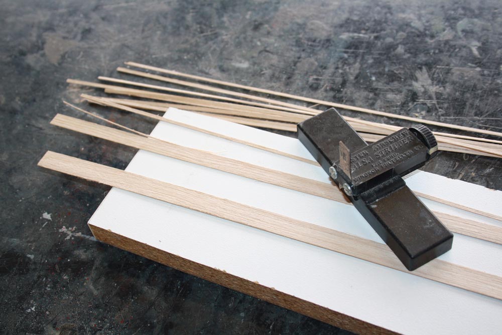The wood for the ribs was sanded a little thinner to .75mm thick. I cut these to 2mm thick using a balsa cutter and a sharp modelling knife.