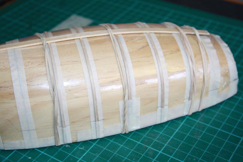 The ribs are glued onto the tape on the center line and at the edges. Things were held in place with rubber bands until the glue dries.