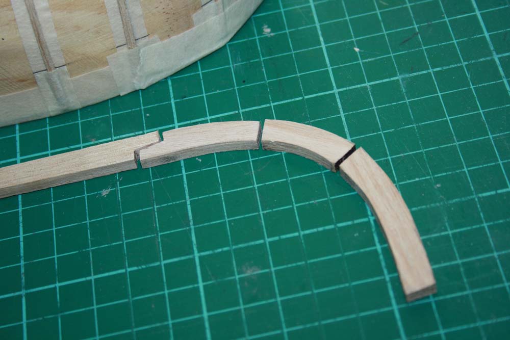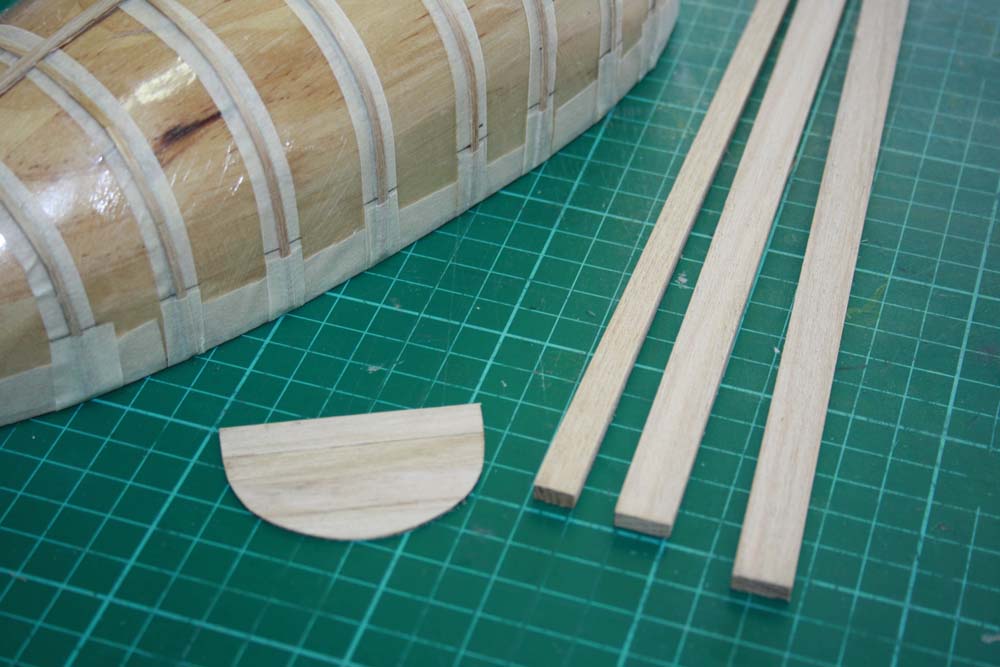 The planks for this model were cut from Tasmanian Oak. The hull planks were cut and finished to a size of 12mm wide by 1mm thick.