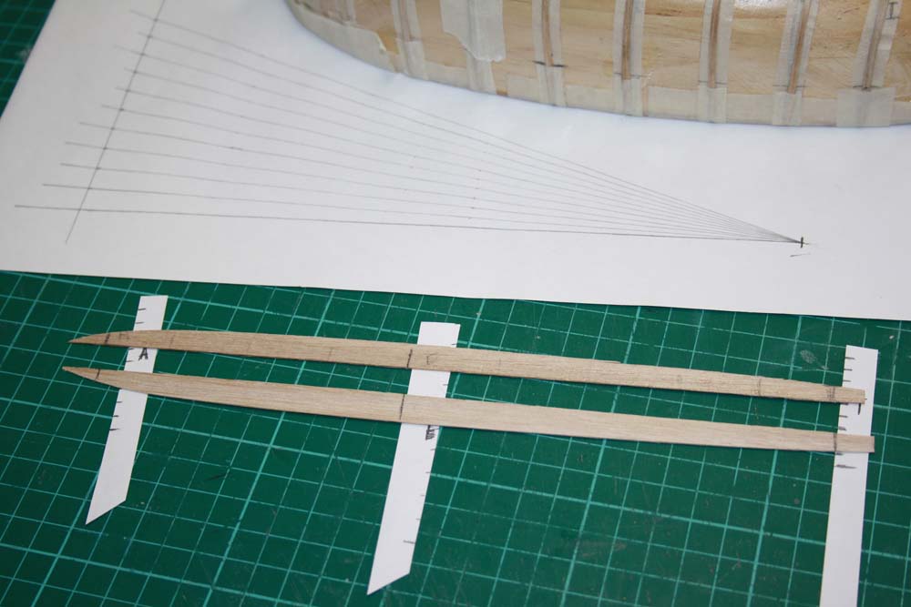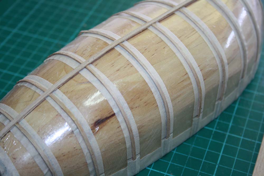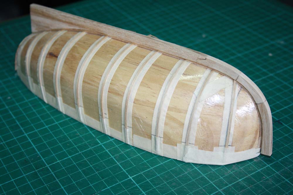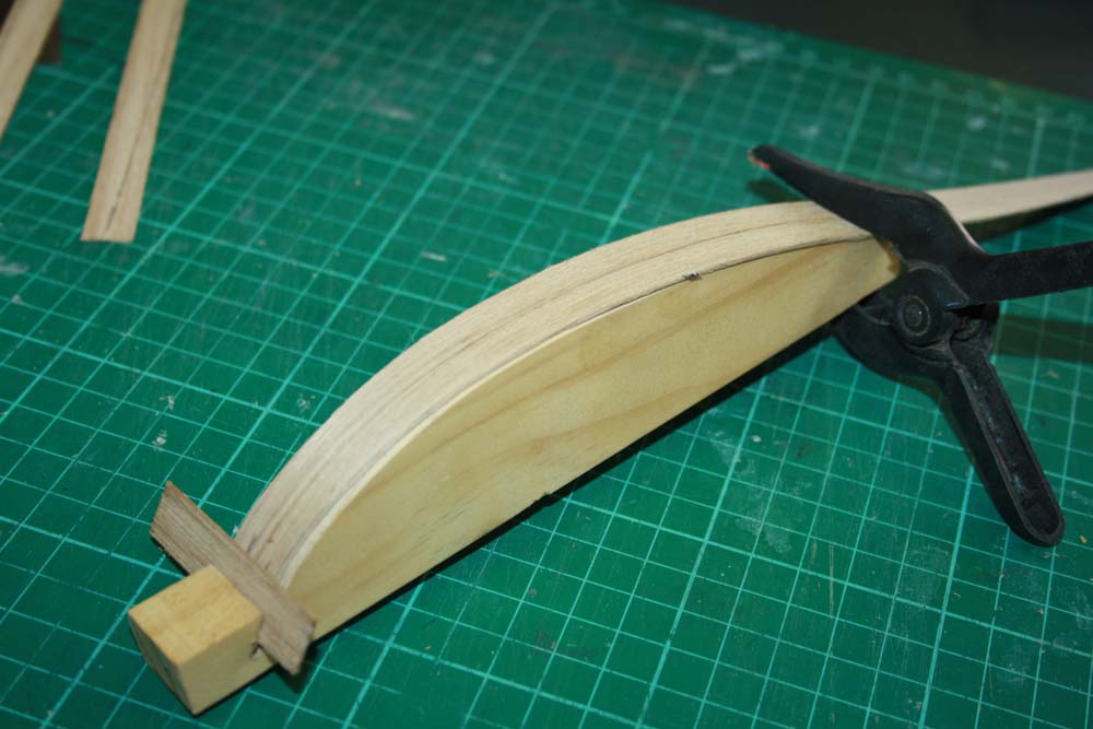 Some of the frames required soaking in water to allow them to bend to the required shape. When all of the ribs were in place a timber the same thickness as the planks and about 3mm wide is glued along the center line of the hull.