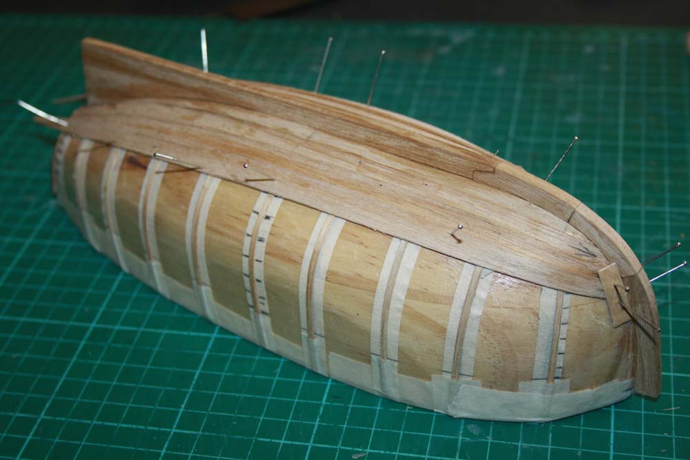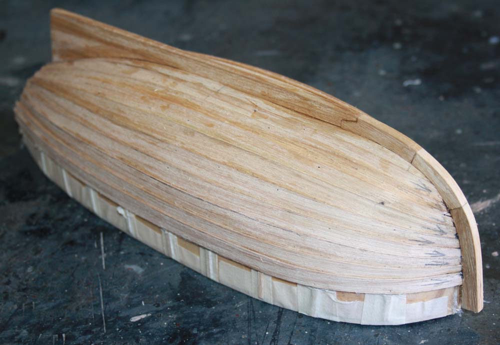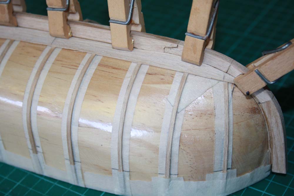 The garboard strakes were glued in place. The edge should sit neatly into the rebate under the keel pieces.