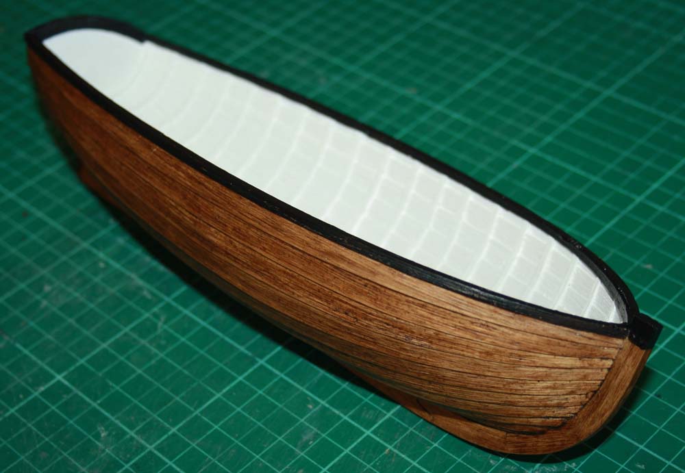 Coated the outside of the hull with a light stain. Painted the inside white and painted the gunnel. The whole model was then painted with a couple of coats of clear satin varnish.