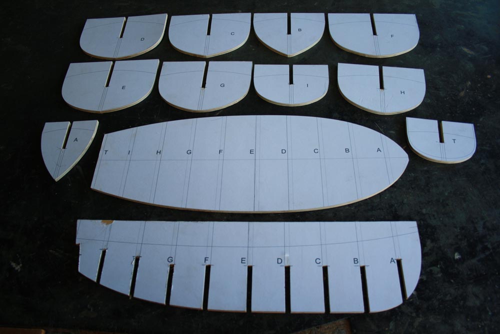 The drawings were printed out on A4 sheets of paper. The paper templates of the frames and keel etc were cut out and glued onto a sheet of plywood. I have used a 900mm x 600mm sheet of 7mm ply from Bunnings for the frames and keel.