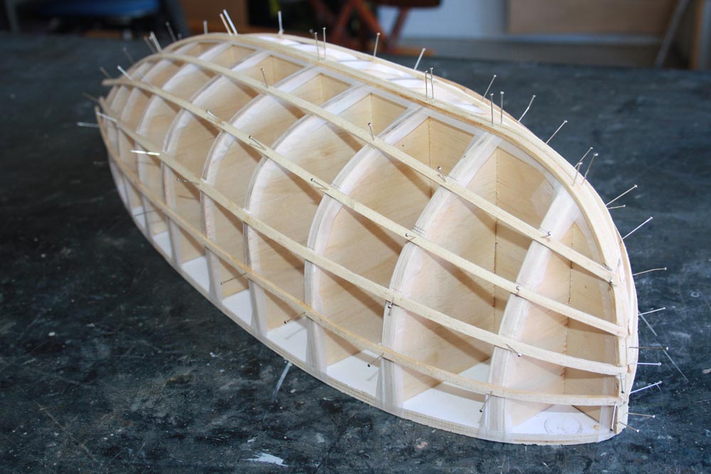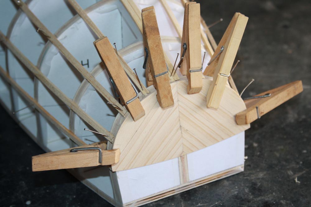 So now it is time to start planking. Because these planks are quite thin, they will bend easily over the stringers. We want to lay the first few planks at 45 degrees some where near the center of the hull. I would recommend laying three or four planks on one side then lay the same number on the opposite side. Each plank is glued to each stringer and it is also edge glued to the plank beside it. Clamping the planks in place while the glue dries can be done with pegs, clamps, pins, tape or what even else works for you.