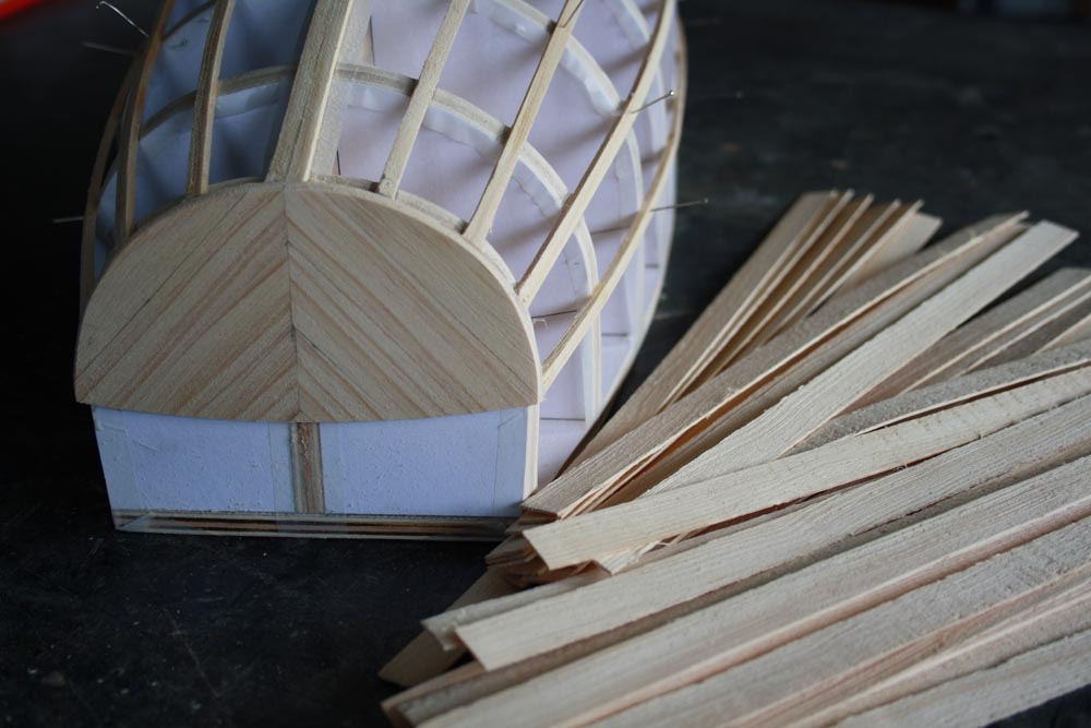 Continue planking until both sides of the hull are covered in two layers of planks. As with the first layer, many of the planks will need tapering a little to get them to fit properly.