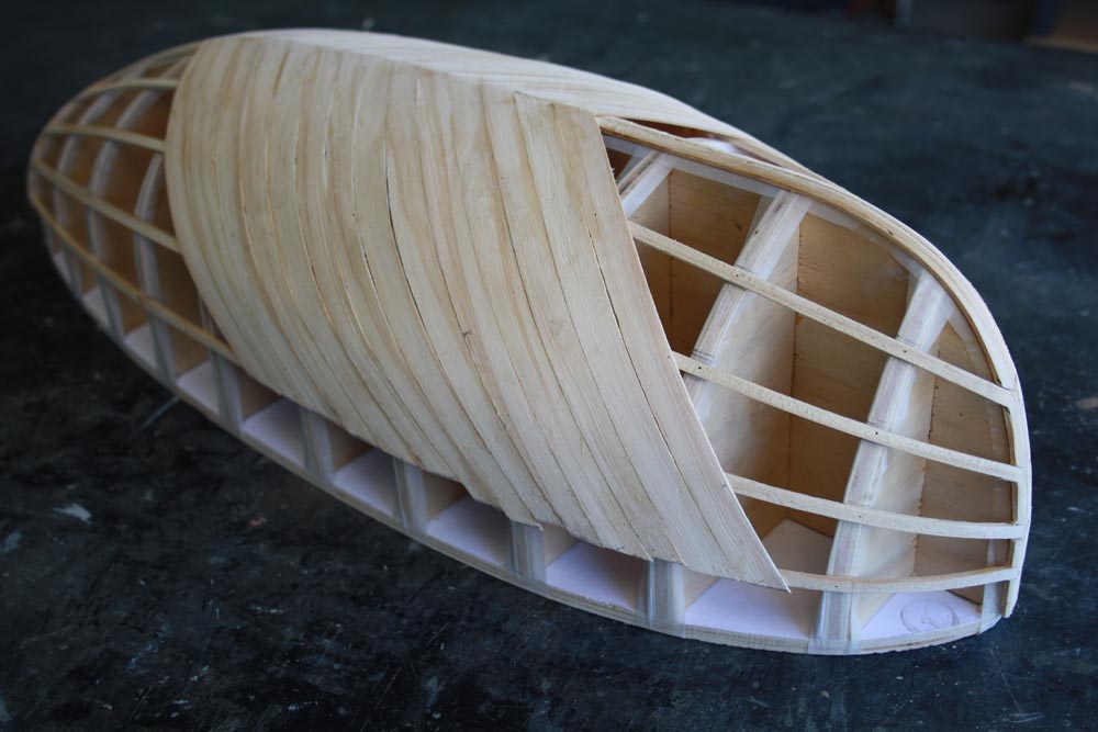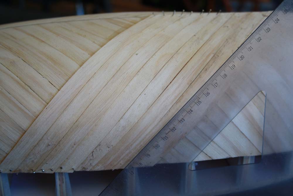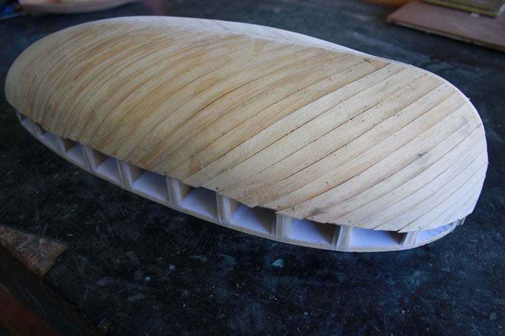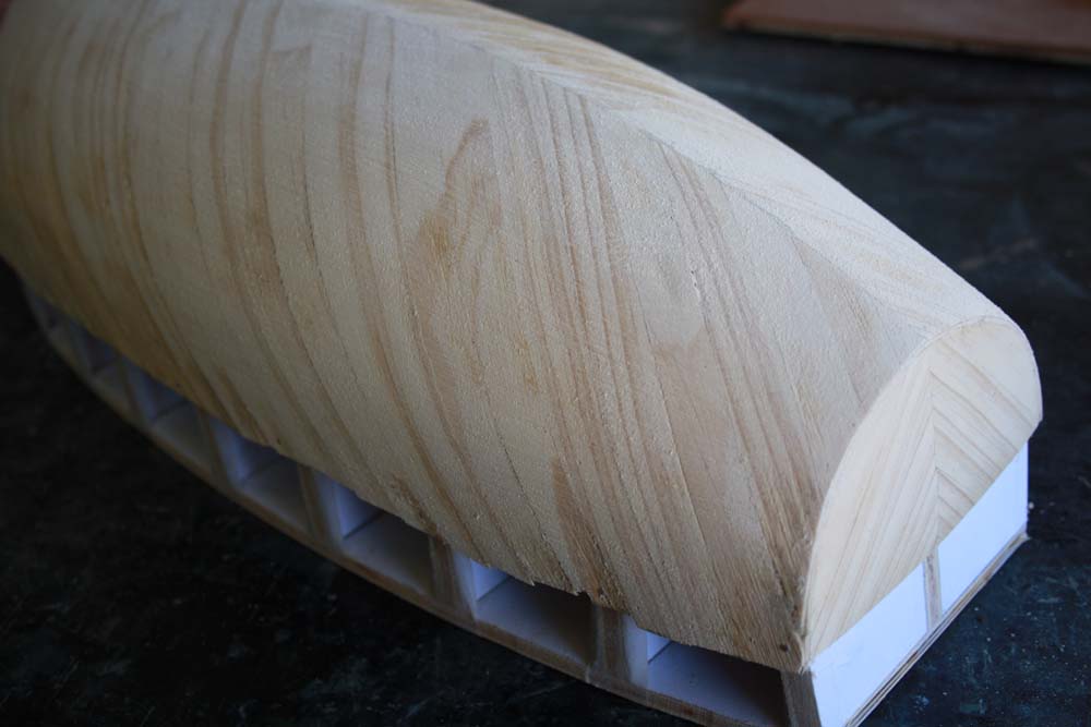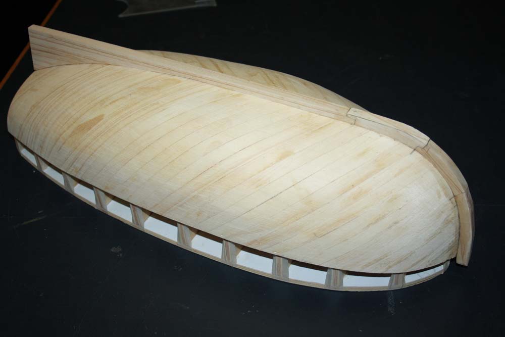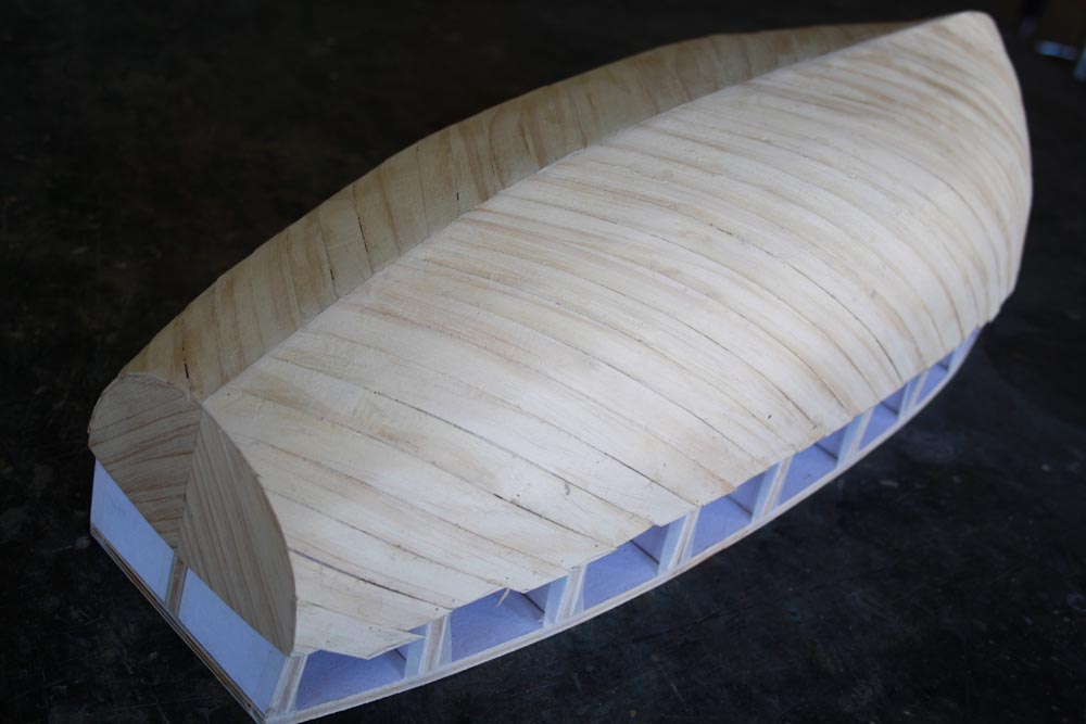 Continue your planking forward and back until you have the entire first layer fitted. Once it is all planked give the whole thing a bit of a sand to take off any high spots.