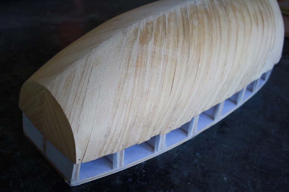 After the course sanding use a finer grade of sand paper to get a smooth hull all over.