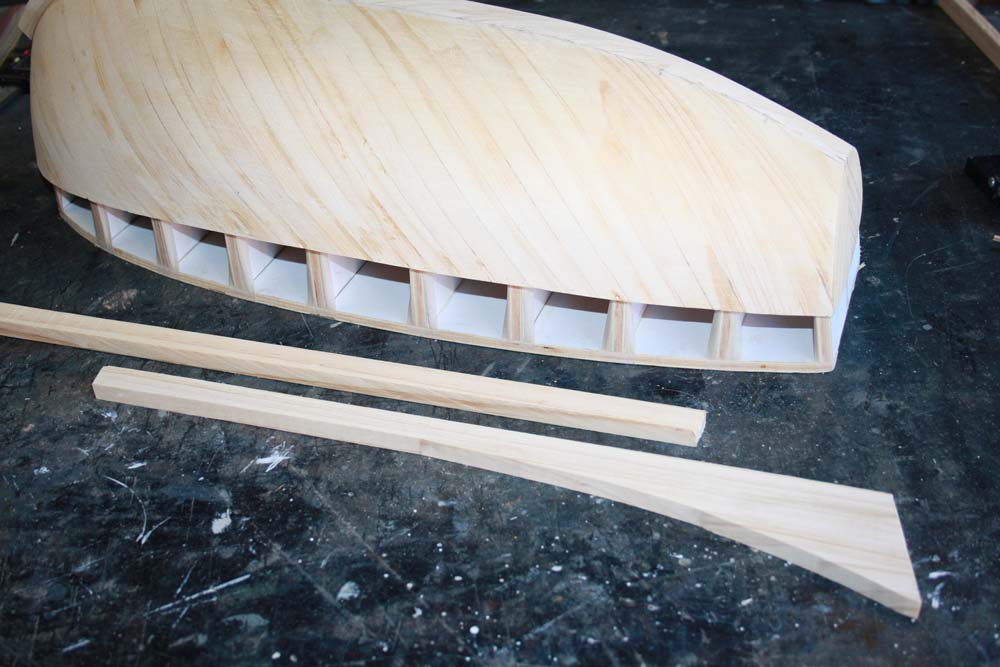 Keel and stem pieces were glued in place. The whole model was then sanded. I added additional stringers inside the hull and then added the gunnel timbers.
